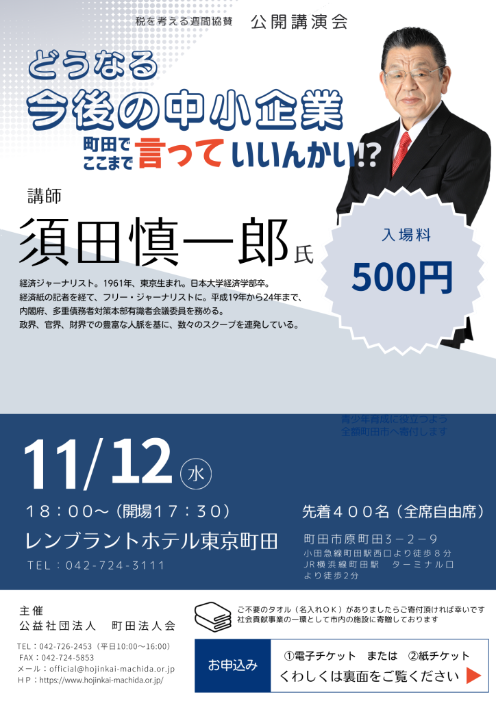 講座 11月12日(水)どうなる今後の中小企業 町田でここまで言っていいんかい!? 2025年9月24日 町田法人会公開講座 どうなる今後の中小企業 町田でここまで言っていいんかい!? 日 時:2025年11月12日(水)17:30会場/18:00開演 会 場:レンブラントホテル東京町田(町田市原町田3-2-9) 入場料:おひとり500円 <お申込> ■町田法人会会員の方はこちら からお申込ください。 ■一般の方はこちら からお申込ください。 【本イベントに関する問合せ先】 町田法人会 ☎ 042-726-2453(受付時間 10:00~16:00) Tweet Pocket Post navigation Previous: 【満員御礼】10月26日(日)「うたごえはミルフィーユ」キャストお話会in町田 事前購入予約 Next: 【12月12日(金)宇宙★星をみに行こう!】 より多くの物語